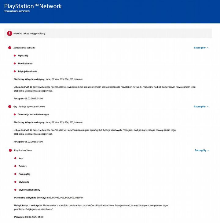 ![Status usług PlayStation Network. Źródło: Sony - Ogólnoświatowa awaria PlayStation Network [Aktualizacja] - wiadomość - 2025-02-09](https://cdn.gracza.pl/galeria/Html/Wiadomosci/2034202468.jpg)