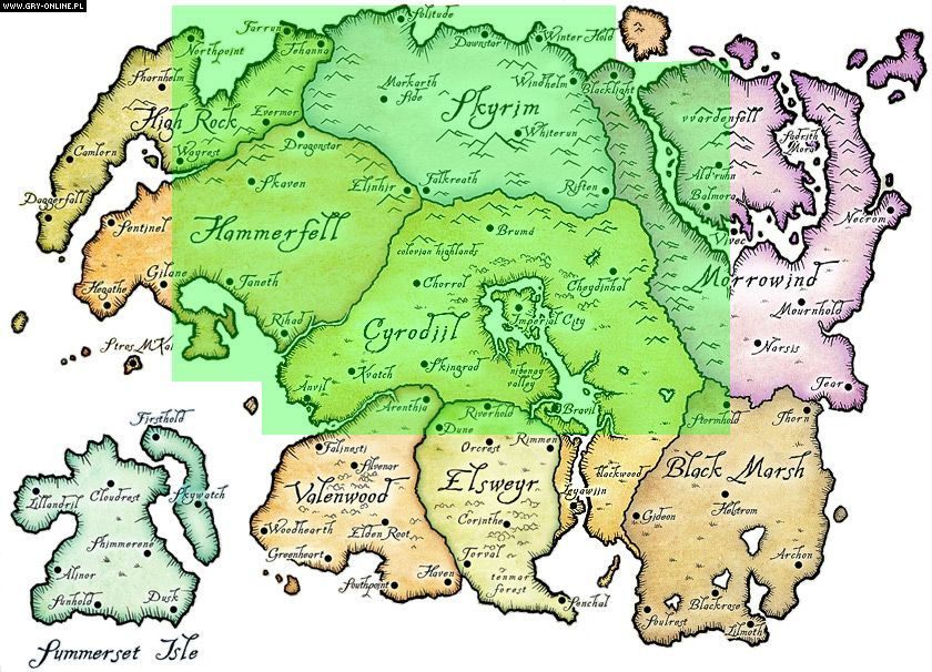Jak widać, w The Elder Scrolls V: Skyrim odwzorowano bardzo dużą część krainy Tamriel. Co prawda, cały teren nienależący do tytułowej prowincji pokryty jest teksturami marnej jakości, ale ciężko uwierzyć, że taka masa terenu i dodatki w stylu Białej Wieży w stolicy imperium zostały stworzone „ot tak”.