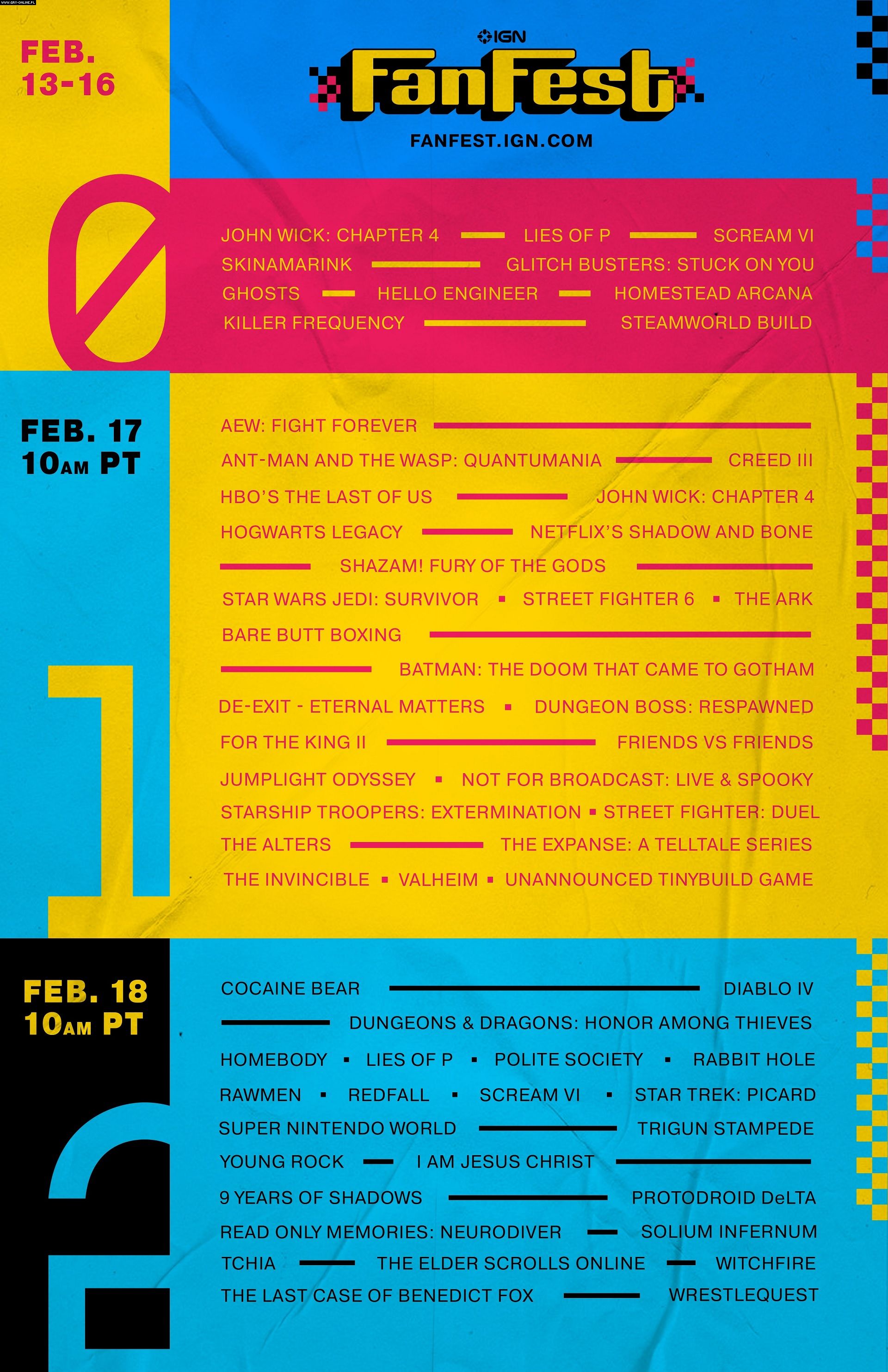Pełną listą pokazów składających się na IGN Fan Fest prezentuje poniższa grafika.