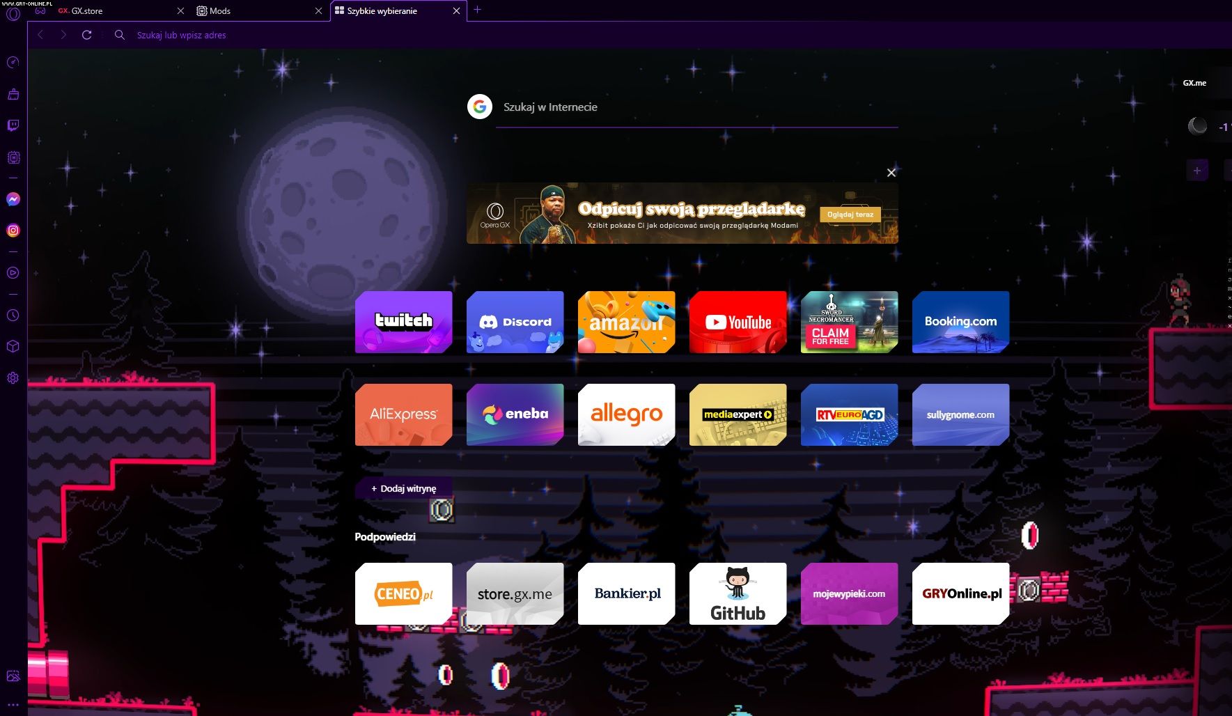 Przeglądarki mają złą renomę ponieważ są nudne. Opera GX została zaprojektowana tak, aby była inna. Dzięki Modom chcemy dać naszym użytkownikom możliwość ekspresji oraz wyrażenia siebie, zamiast zmuszać ich do trzymania się z góry narzuconego zestawu domyślnych opcji.