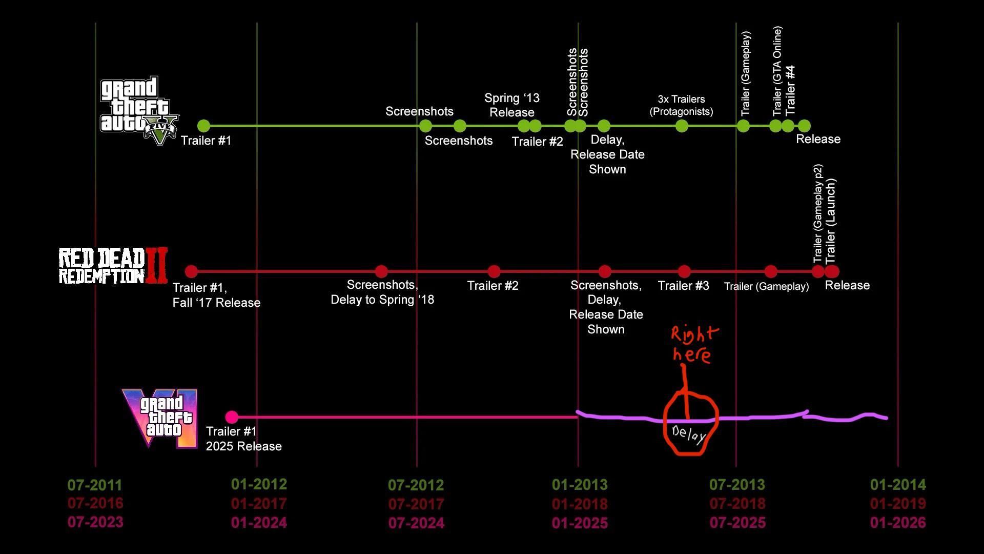 Na podstawie powyższego grafu widać niepokojącą tendencję, którą trafnie opisał Redditor Expert-Examination86: „Opóźnienia u Rockstara są normalne. Cisza w eterze po wypuszczeniu trailera nie jest normalna”. Od publikacji grudniowego zwiastuna do momentu poinformowania o przesunięciu premiery GTA 6 nie ukazały się żadne konkretne materiały promocyjne, co według części internatów oznacza znacznie dłuższy czas oczekiwania, niż sugeruje nowojorskie studio.