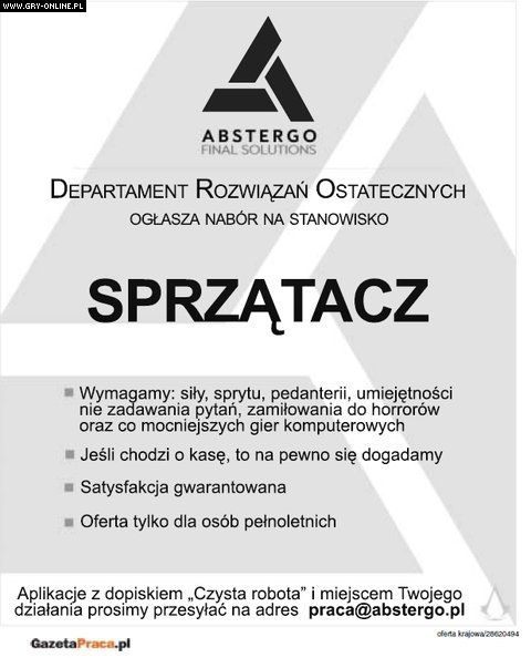 Podobne ogłoszenie o pracę pojawiło się na łamach portalu GazetaPraca.pl. Dowiadujemy się w nim, że Abstergo Final Solutions, czyli Departament Rozwiązań Ostatecznych, ogłasza nabór na stanowisko sprzątacza. Organizację znają zapewne fani jednej z ciekawszych serii gier akcji ostatnich lat, której druga odsłona zdobyła niedawno wysokie oceny w mediach.