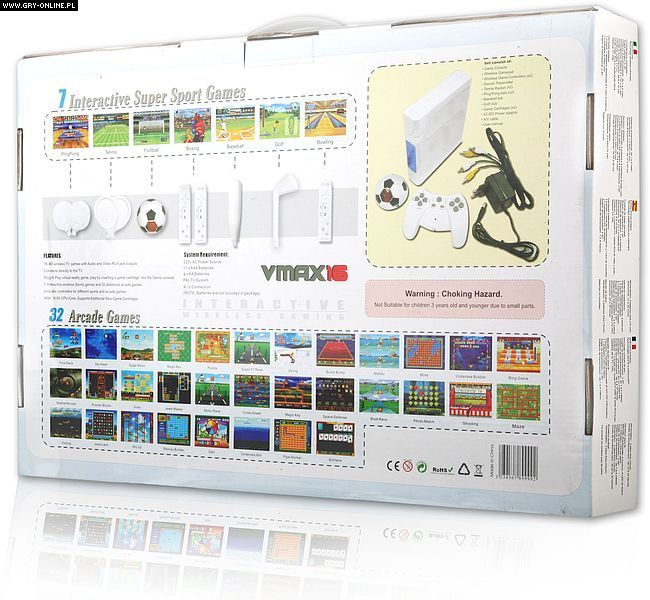Tak, moi drodzy, oto przed wami zaawansowany sprzęt, który pełnymi garściami czerpie z technologicznego zaawansowania swego japońskiego konkurenta dodając do tego iście chińską swojskość i, co ważniejsze, atrakcyjną cenę. Czym jest VMAX16? „Jest to nowoczesne i łatwe w obsłudze urządzenie, które zapewni rozrywkę całej rodzinie” głosi treść informacji prasowej. Pamiętacie popularne kilkanaście lat temu podróbki Pegasusa z jednym, wmontowanym na stałe, kartridżem wyposażonym w 100 gier? Jeśli tak, to wasze wspomnienia zostaną mile połechtane VMAXem. Sprzęt ów posiada wbudowanych 39 gier oraz cały tabun bezprzewodowych kontrolerów. Jeśli jesteś fanem Wii Sports, zainteresuje cię 7 gier sportowych (Baseball, Golf, Tenis, Tenis stołowy, Piłka nożna, Kręgle oraz Boks), w których zabawa polega na machaniu jednym z kliku odpowiednio ukształtowanych manipulatorów z wbudowanymi czujnikami ruchu (które „dokładnie odwzorowują manewry we wszystkich kierunkach” ). Nintendo się chowa, wszak ma tylko wiimote’a i balance board. Jeśli zaś znudzisz się sportem, pozostaje chwycenie bezprzewodowego pada, który posiada wbudowane aż 32 gry arcadowe. A to wszystko dostępne jest od razu po wetknięciu dołączonego kabla AV do twojego telewizora.