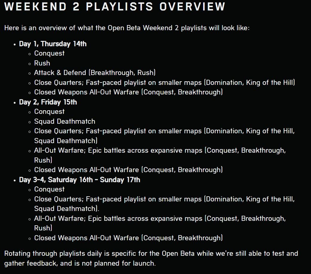 Obecna druga tura testów potrwa do 18 sierpnia do godziny 10:00 rano. Poza zawartością, którą znamy z poprzednich testów, twórcy dodali dwa nowe tryby rozgrywki: Rush oraz Squad Death Match. Do tego dostępna jest także nowa mapa o nazwie Empire State – przeznaczona wyłącznie dla piechoty i umiejscowiona w Brooklynie, w Nowym Jorku.
