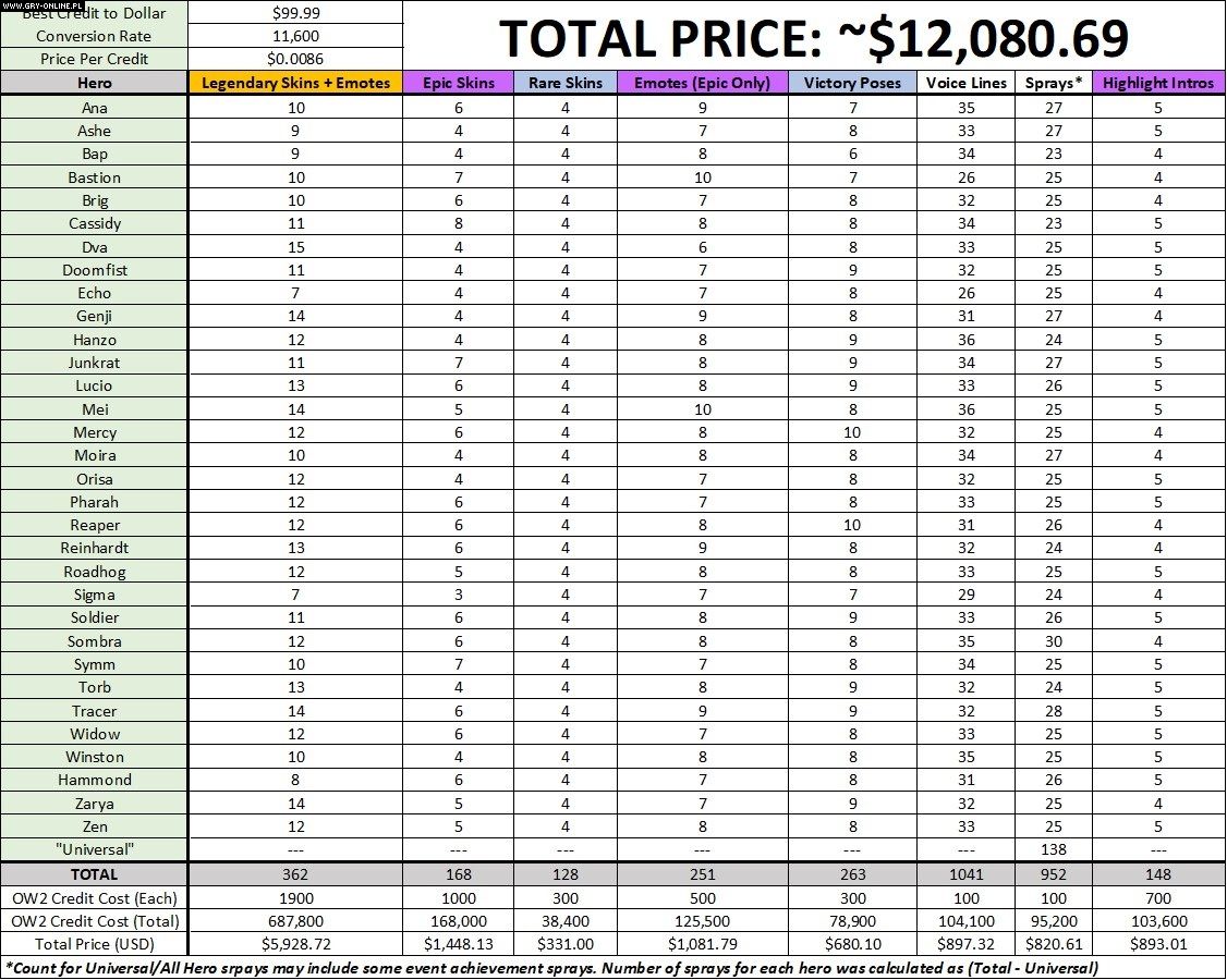 Co się tyczy mikrotransakcji – jeśli zastanawiacie się, jak głęboko trzeba sięgnąć do portfela, by odblokować wszystkie skórki z pierwszego Overwatcha, to z pomocą przychodzą obliczenia użytkownika Reddita o pseudonimie loliscoolyay4me. Wykazał on, że jest to koszt rzędu 12 tys. dolarów (ok. 59 tys. zł.). Co przyniesie Overwatch 2? Przekonamy się już niebawem.