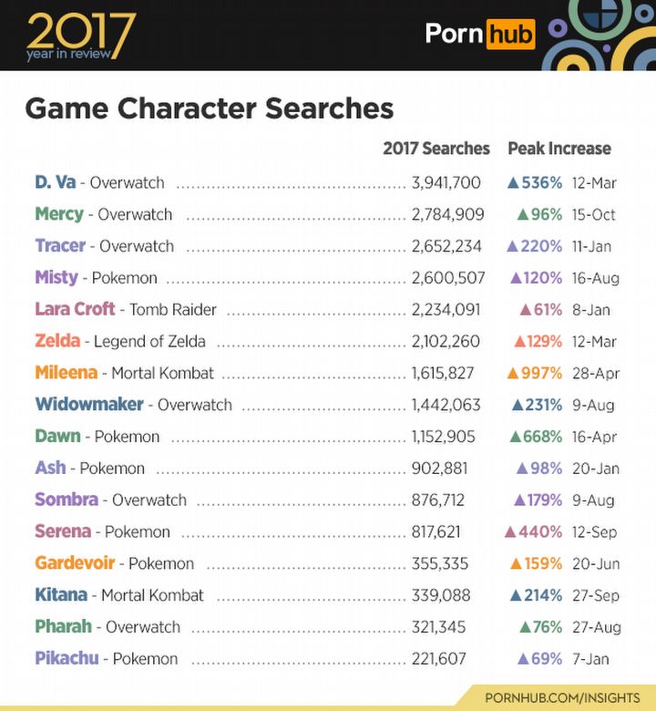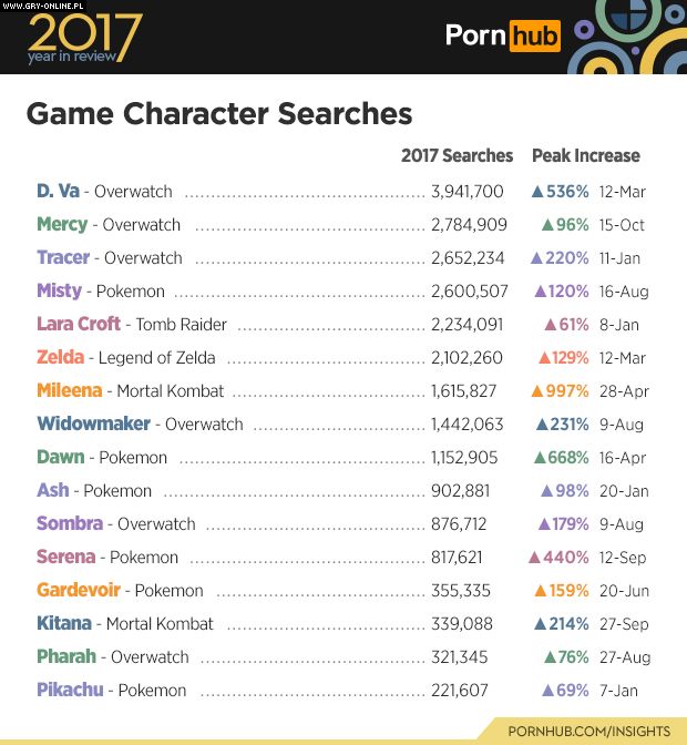 Przede wszystkim dotyczą one bohaterów gier najczęściej szukanych na Pornhub. Pod tym względem niepodzielnie króluje Overwatch. Imię samej tylko D.Vy wpisywano aż 3 941 700 razy. Na drugim miejscu w tym zestawieniu znalazła się Łaska, która może pochwalić się 2 784 909 wyszukiwaniami. Trzecie miejsce przypadło Smudze z 2 652 234 wyszukiwaniami. Tuż za podium znalazła się znana z Pokemonów Misty, której do brytyjskiej pilotki z umiejętnością szybkiego przemieszczania się zabrakło 52 tysięcy kliknięć. Zaskakiwać nieco może dopiero piąte miejsce Lary Croft, która przez lata była uważana za symbol seksu jeśli chodzi o bohaterki gier komputerowych. Piękną panią archeolog wyszukiwano „zaledwie” 2 234 091 razy. W pierwszej szesnastce omawianego zestawienia nie zabrakło również takich postaci, jak księżniczka Zelda, Pikachu (sic!), czy Kitana i Mileena z Mortal Kombat. Co ciekawie, liczba wyszukiwań tej ostatniej pani 28 kwietnia 2017 roku wzrosła aż o 997%.