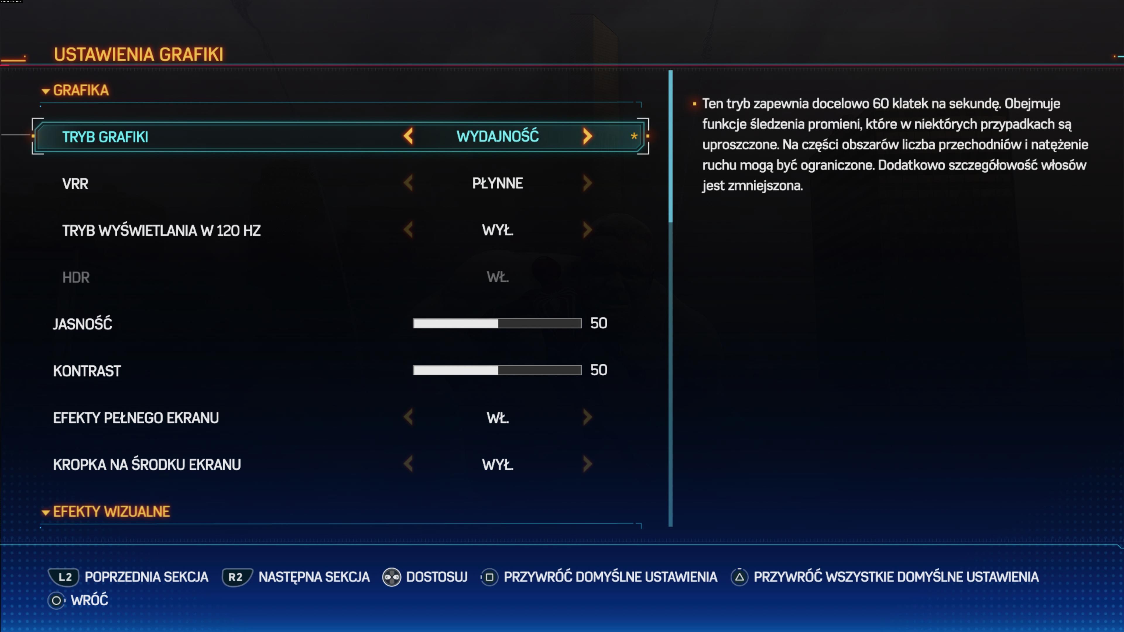 Spider-Man 2 oferuje też znakomity VRR (zmienną częstotliwość odświeżania), dzięki któremu można znacząco zniwelować jakiekolwiek spadki wydajności. Co ciekawe, telewizory wspierające VRR mogą skorzystać także z funkcji odblokowania ilości fps-ów. Oznacza to, że w trybie 40 fps jesteście w stanie uzyskać mniej więcej 44-45 klatek, a w trybie wydajności nawet 70 klatek na sekundę. Co prawda licznik fps-ów „skacze” wtedy, ale użycie VRR powoduje, że nie odczuwa się tego w zasadzie wcale.