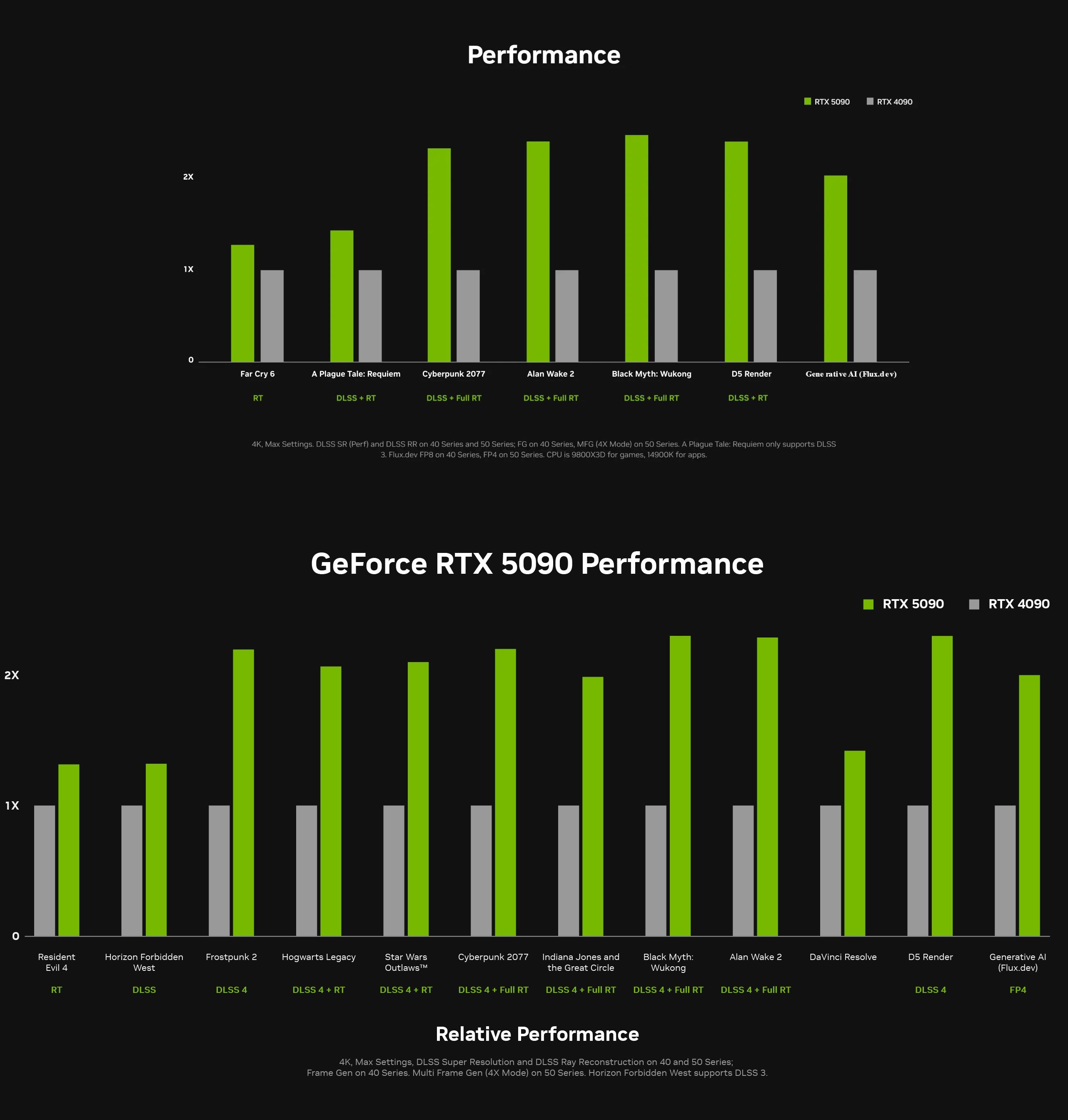 Niestety rzeczywistość okazała się mocno rozczarowująca. Opublikowane przez Nvidię wykresy nie dotyczyły bowiem czystej wydajności. Aby uzyskać obiecywane osiągi wymagane jest korzystanie z technologii skalowania obrazu DLSS 4 i Multi Frame Generation. Nie było to więc jawne oszustwo, jednak potencjalni klienci nie zaznajomieni z nomenklaturą branżową mogli zostać łatwo wprowadzeni w błąd. Poniżej możecie zobaczyć porównanie dwóch wykresów wydajności opublikowanych przez „zielonych” przed i po premierze RTX-a 5090. Możemy zauważyć, że firma wprowadziła pewne korekty, jednak nadal brakuje jasnych informacji o ustawieniach DLSS i generatorów klatek.