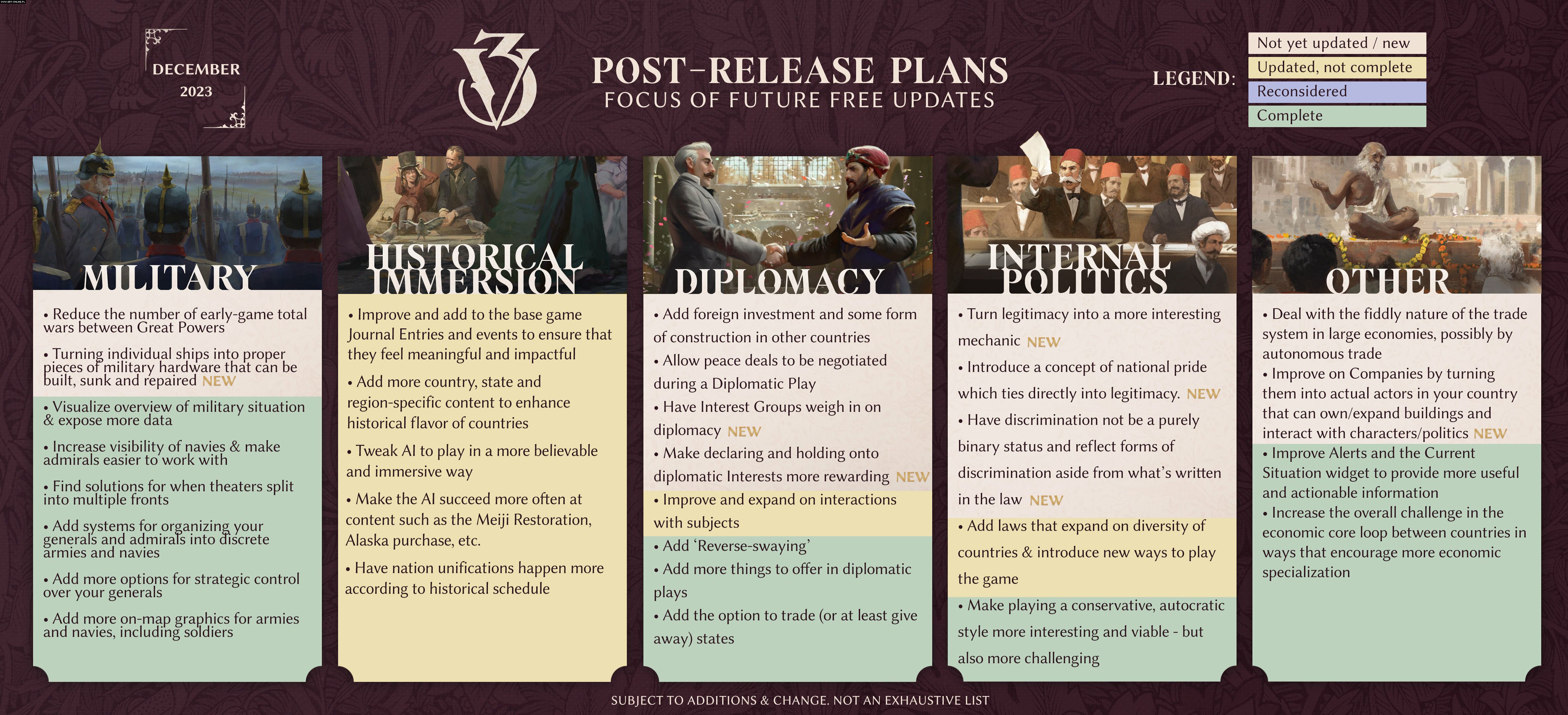 Planowanych zmian jest znacznie więcej. Jeżeli chcecie zapoznać się ze wszystkimi szczegółami, to odsyłam Was do wpisu na Steamie. Skróconą listę nowinek zawierającą również elementy, które zostały w ostatnim czasie wprowadzone do Victorii 3 przez deweloperów, zobaczycie poniżej.