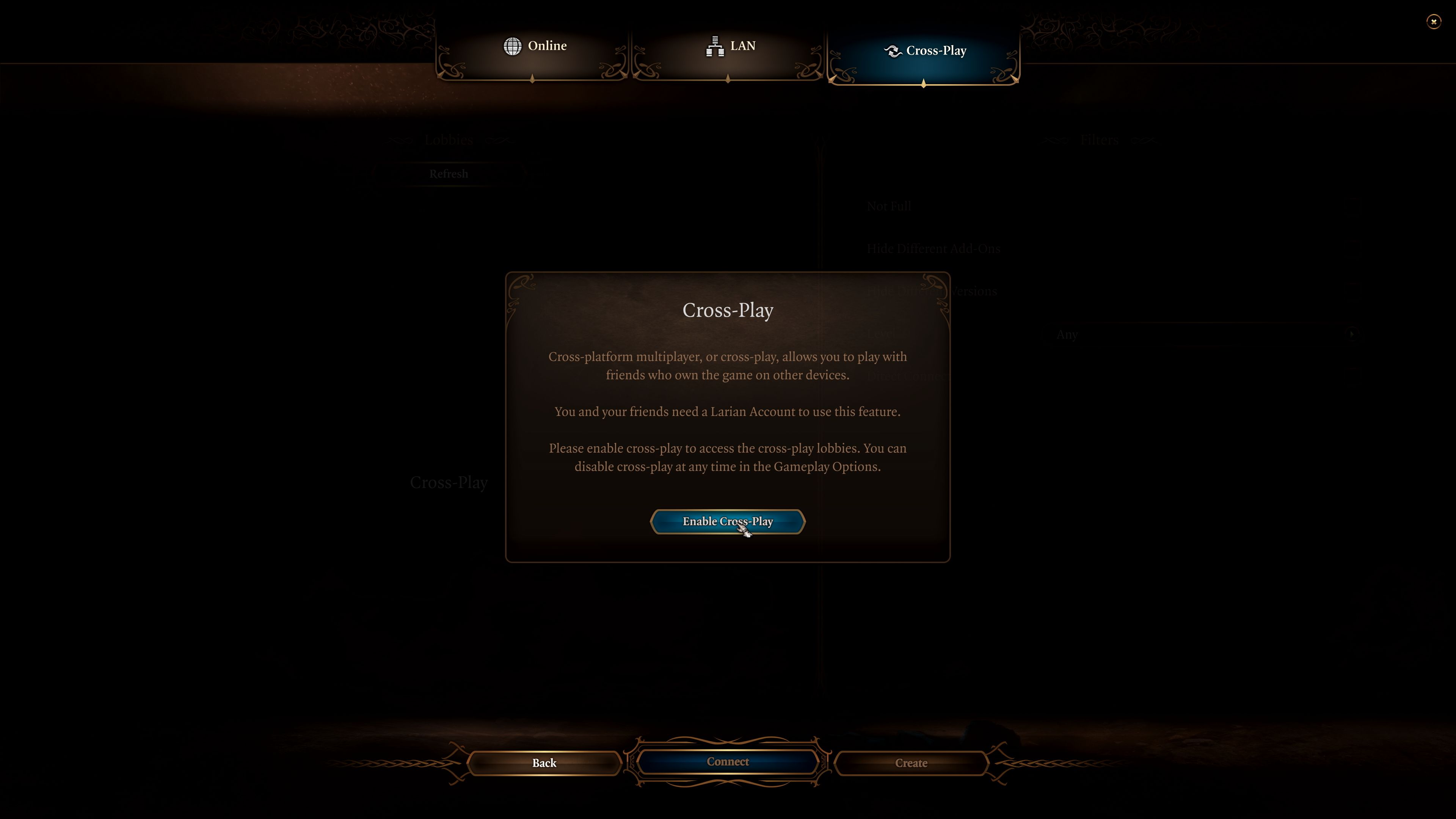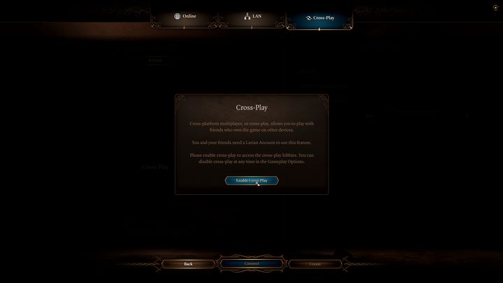 W komunikacie Larian pokazało zrzut ekranu, na którym widzimy proces uruchamiania crossplayu w BG 3. Po wprowadzeniu tej opcji mamy być w stanie zapraszać bezpośrednio do gry naszych znajomych korzystających z różnych platform. Warto dodać, że aby uruchomić tę funkcję, trzeba będzie posiadać konto w Larian Network.