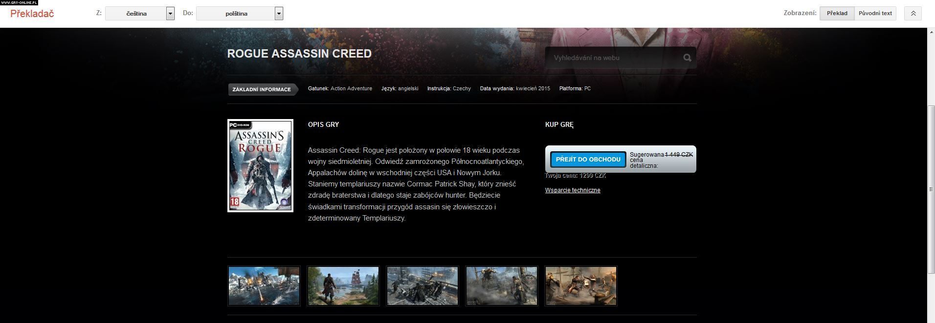 Assassin’s Creed: Rogue był ostatnim przedstawicielem serii Assassin’s Creed, który wydany został na konsolach Xbox 360 i PlayStation 3. Produkcja zadebiutowała na obu systemach jesienią ubiegłego roku praktycznie równocześnie z Assassin’s Creed Unity, zbierając przy tym względnie pozytywne oceny graczy. Jeszcze przed premierą Rogue, Ubisoft potwierdził, że gra w późniejszym terminie pojawi się także na komputerach PC. Do tej pory wydawca nie podał jednak dokładnej daty. Jak zauważył serwis DSOGaming, jeden z czeskich sklepów internetowych ujawnił, że tytuł powinien trafić do sprzedaży w kwietniu. Istnieje więc duże prawdopodobieństwo, że załoga sklepu nie pomyliła się i przedwcześnie opublikowała oficjalne informacje od Ubisoftu. Jeżeli kwietniowa data debiutu jest prawdziwa, w najbliższych tygodniach powinniśmy spodziewać się konkretnych zapowiedzi od producentów.