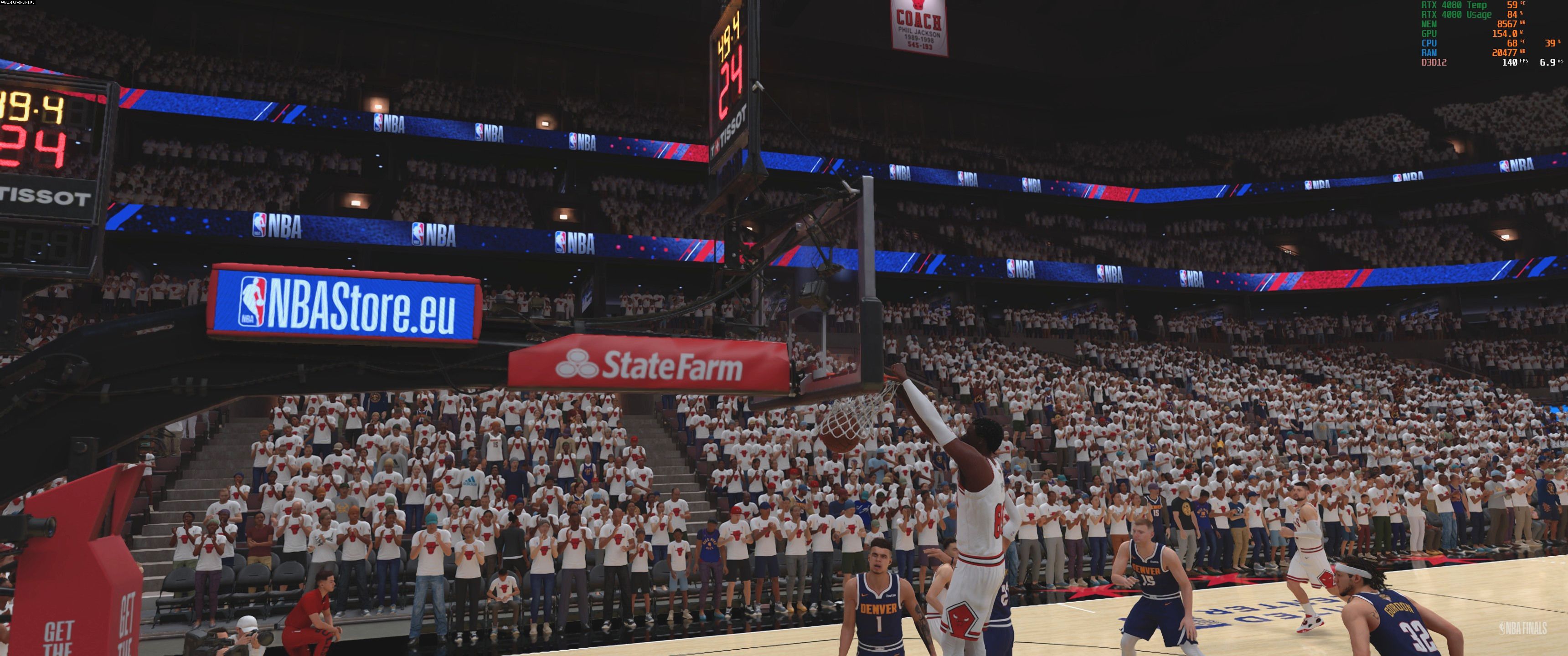 Przechodząc do mojego głównego peceta z RTX-em 4080, i5-13600K i 32 GB pamięci RAM wiedziałem, czego się spodziewać. Po ustawieniu wszystkiego na ultra, włączeniu DLSS w trybie jakości, w rozdzielczości 3440 na 1440 pikseli, NBA 2K25 działało w mniej więcej 140 klatkach na sekundę. Co ciekawe, gra wykorzystywała zaledwie 86-88% mocy karty graficznej i 40% procesora, więc jest tu jeszcze miejsce dla deweloperów do optymalizacji. Muszę Was też uprzedzić, że NBA 2K25 jest dość żarłoczne, jeśli chodzi o RAM, a jego wykorzystanie w zasadzie nigdy nie spadało poniżej 20 GB.