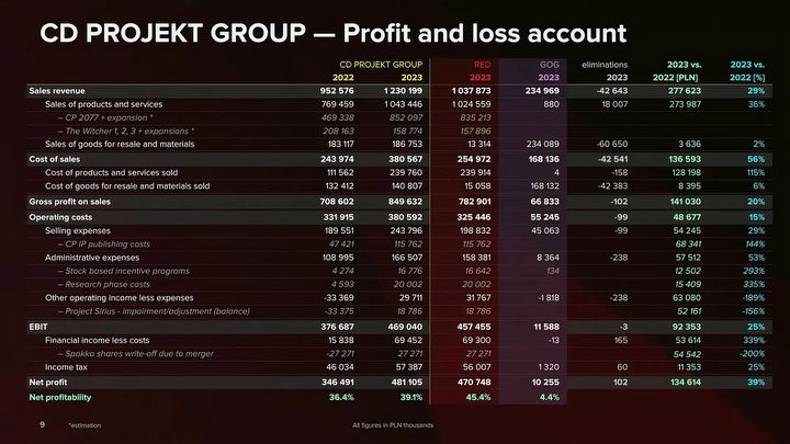 Zacznijmy jednak od kwestii najbardziej interesujących inwestorów. Grupa CD Projekt pochwaliła się, iż 2023 rok to pod względem zysków drugi najlepszy rok w jej historii, wyraźnie lepszy niż 2022 rok. Podkreślmy, że rekordowym pozostaje 2020 rok, czyli ten, w którym odbyła się premiera Cyberpunka 2077.