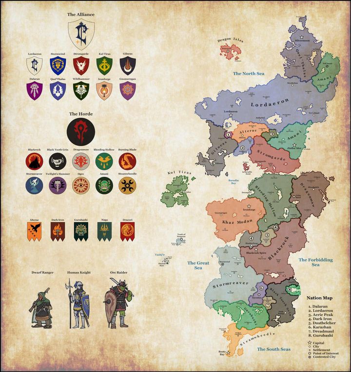 To jest mapa, którą zrobiłem, wraz z symbolami/flagami frakcji Wschodnich Królestw na początku Drugiej Wojny. Jest to mój ulubiony okres w lore WoW-a, ponieważ nie ma tu dużo kosmicznych zawirowań, a zamiast tego jest sporo bohaterów i złoczyńców, których lubi społeczność.