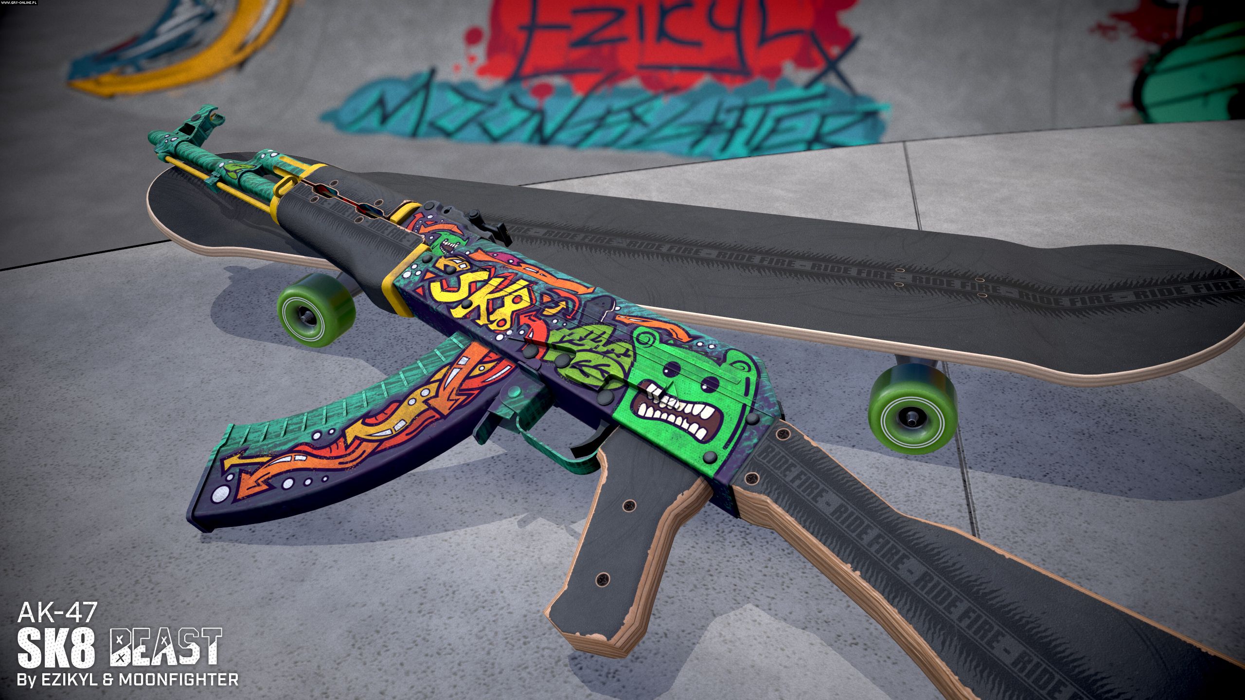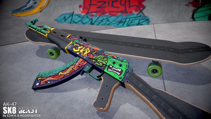 Skórka do broni AK-47 inspirowana kulturą skateboardingu (niektóre elementy mają przywodzić na myśl fragmenty deskorolki).