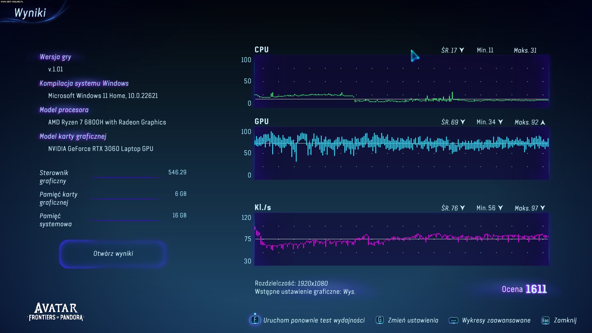 Na laptopie z RTX 3060 gra działa na ultra, ale osobiście odradzałbym wybór takiego ustawienia. W natywnym Full HD otrzymujemy zaledwie 40 kl./s (ze spadkami do 29), a z DLSS w trybie zbalansowanym średnio 61 kl./s (z minimalną liczbą klatek na poziomie 43). Niby wystarczy, ale grając odczuwamy pewien niedosyt, zwłaszcza jak w bardziej naładowanej roślinnością scenerii przy malowniczym powiewie wiatru obraz nagle zwolni.