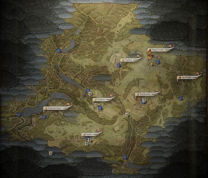 Mapa, którą widzicie powyżej, początkowo będzie zakryta mgłą. Odsłonimy ją w trakcie eksploracji. Znajdują się na niej nie tylko rozległe tereny pełne malowniczych krajobrazów, ale także kilka mniejszych osad oraz zamek Trosky – pierwszy duży cel Henryka. Mapa zdradza też nazwy lokacji, w których w przyszłości podejmiemy się zadań pobocznych. Sądząc po informacjach ujawnionych niedawno przez Czechów na temat czasu potrzebnego do ukończenia gry – od 60 do nawet 120 godzin – chyba zdążymy poznać ją jak własną kieszeń.