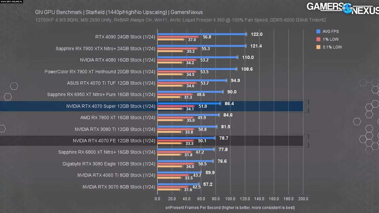 GeForce RTX 4070 SUPER sprawuje się dobrze zarówno w rozdzielczości 1080p, jak i 1440p. Nawet na ekranach 4K nadal trzyma się dzielnie, utrzymując swoje miejsce w hierarchii wydajności, pomiędzy mocniejszym i słabszym bratem. Jednak 53 fps w Starfieldzie (ustawienia wysokie, 4K) dla wielu może nie być wystarczające do komfortowego grania. Zawsze to lepiej jednak, niż 46 fps przy RTX 4070.
