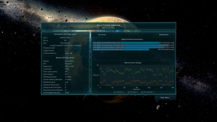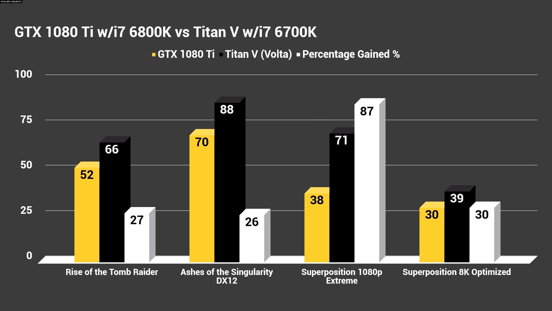 W benchmarku Superposition Titan V osiągnął wynik 9431 punktów, w porównaniu do 8642 – wcześniejszego rekordu osiągniętego przy użyciu karty GeForce GTX 1080Ti. W Ashes of Singularity średnia liczba klatek animacji wyniosła ponad 76. W Rise of The Tomb Raider (maksymalne ustawienia w rozdzielczości 1440p) wykręcono około 65,5 FPS, a w Gears of War 4 aż 157,5 klatek na sekundę przy ustawieniach ultra i rozdzielczości 1440p. W zależności od gry lub benchmarku są to wartości lepsze od tych uzyskiwanych przez GTX-a 1080Ti o 26-87%.