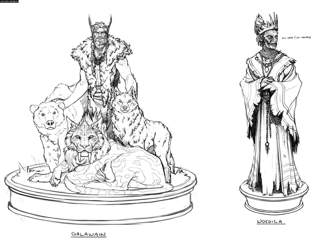 W noworocznym wpisie poznaliśmy także kolejne informacje o bogach funkcjonujących w świecie Pillars of Eternity. Na poniższym arcie przedstawiono dwoje z nich. Z lewej widzimy Galawaina, patrona wszelkiego typu polowań, czczonego przez ludzi zajmujących się podróżami i pościgami, a więc poszukiwaczy skarbów, pograniczników, odkrywców, a nawet uczonych. Wyznawcy Galawaina często noszą ze sobą małą, wyrzeźbioną głowę psa na szyi. Drugą postacią jest Woedica, znana też pod imionami Wypędzona Królowa czy Dusicielka. W skład jej boskiej domeny wchodzi prawo, sprawiedliwość, przyrzeczenia i obietnice, ale także zemsta. Kapłanki Woedici służą w miastach i miasteczkach jako prawniczki, a najbardziej wpływowe z nich doradzają królom i możnowładcom. „Kiedy Woedica odzyska swój tron” to popularne powiedzenie wśród jej wyznawców, odwołujące się do mającej nadejść utopijnej rzeczywistości, w której społeczeństwo zostanie wreszcie zorganizowane we właściwy sposób, a Woedica zajmie przynależną jej funkcję władczyni wśród bogów.