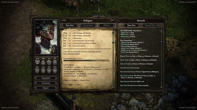 Wśród nowych screenów opublikowanych przez Obsidian Entertainment najciekawszy wydaje się ten przedstawiający kartę postaci. Trzeba przyznać, że pod względem estetycznym zbliżona jest ona do tego, co dobrze znamy np. z Baldur's Gate, ale przecież dokładnie o to twórcom i fanom chodziło! Możemy z niej wyczytać, że Pallegina, opisana postać, należy do boskiej rasy Hylea i jest paladynem na ósmym poziomie. Choć nie jest specjalnie zręczna (ma tylko 18% bonus do celności), to kondycja o wartości 14 daje jej dodatkowe 28% wytrzymałości i zdrowia. Na karcie możemy znaleźć także informacje o tym, ile do tej pory Pallegina podróżowała (17 dni, 3 godziny…), kim był najpotężniejszy wróg przez nią pokonany (Org Matron), a także dowiedzieć się, jaka jest jej reputacja w świecie gry. Wiele innych szczegółów na pewno znajduje się w ukrytych na razie zakładkach.