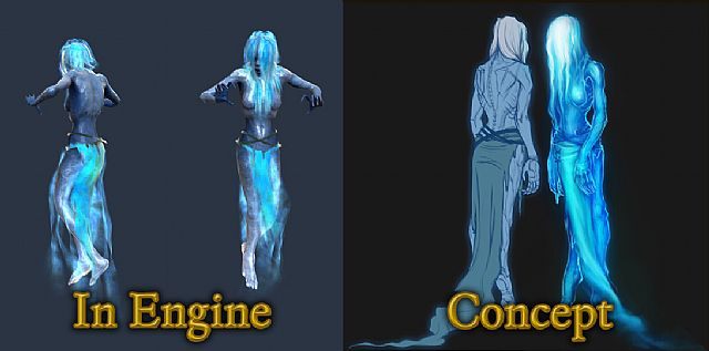 Ponadto twórcy Pillars of Eternity podzielili się informacjami na temat projektowania potworów, które gracze spotkają w świecie gry. Jak napisali, „niemal ukończyliśmy już prace nad stworami o priorytecie A, niedługo zabieramy się za opracowywanie tych z priorytetem B”. Jednym z monstrów wykończonych (do poziomu wersji alfa) jest Cean Gwla, czyli stwór będący duchem kobiety zmarłej w tragicznych okolicznościach, przypominający banshee. Tak oto wygląda porównanie grafiki koncepcyjnej (z prawej) z jej wykonaniem na silniku gry: