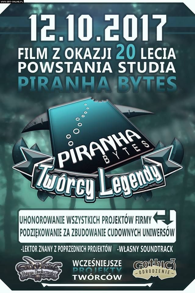 Nie ma wątpliwości, że seria Gothic ma w naszym kraju status legendy. Wielu Polaków niemal z miejsca zakochało się w klimacie tych gier RPG od studia Piranha Bytes. Obecnie fani niemieckich deweloperów wyczekują premiery ich nowego projektu o nazwie Elex, który zadebiutuje 17 października bieżącego roku. Być może nie wszyscy wiedzą, że pięć dni przed pojawieniem się tej gry na rynku będzie miało miejsce inne ważne wydarzenie. 12 października minie równo 20 lat od momentu, w którym byli pracownicy Greenwood Entertainment: Alex Brueggemann, Michael Hoge, Stefan Nyul oraz Tom Putzki, wraz z kilkoma innymi osobami, powołali do życia studio Piranha Bytes Software GmbH. O jubileuszu tym pamięta polska grupa Gothic Forever, odpowiedzialna za stworzenie ciepło przyjętych filmów Gothic - Potęga Społeczności oraz Gothic 3 – Odrodzenie. Na 12 października przygotowują oni premierę swojego kolejnego projektu: Piranha Bytes – Twórcy Legendy.