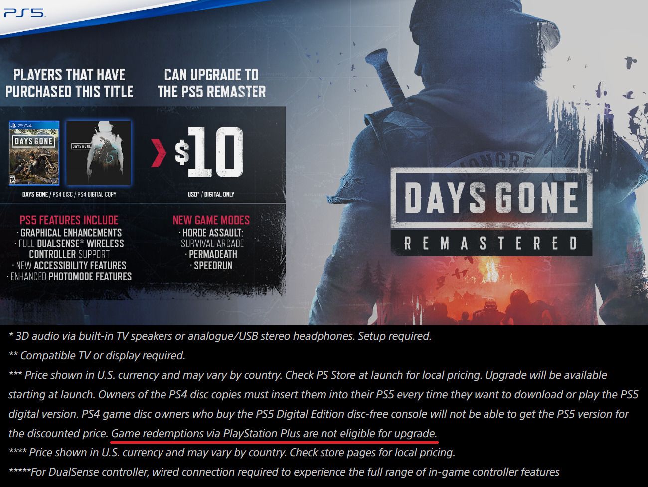 Owa informacja znalazła się na grafice reklamującej płatny upgrade. Jeśli zatem zdobyliście Days Gone poprzez subskrypcję Sony, chcąc zagrać w wersję dedykowaną PS5, będziecie musieli nabyć ją za pełną kwotę – lub zakupić grę na PS4, a później jeszcze wspomnianą aktualizację.