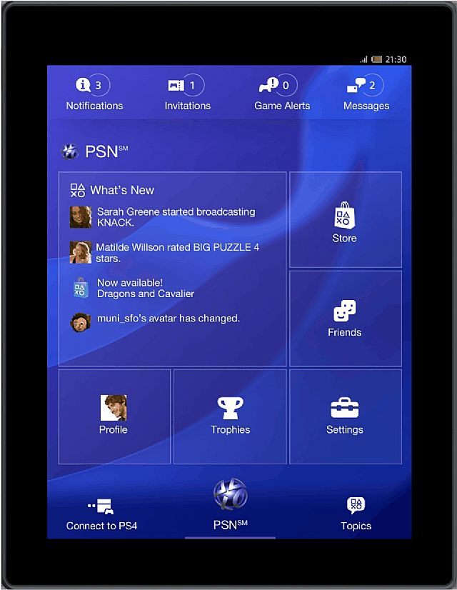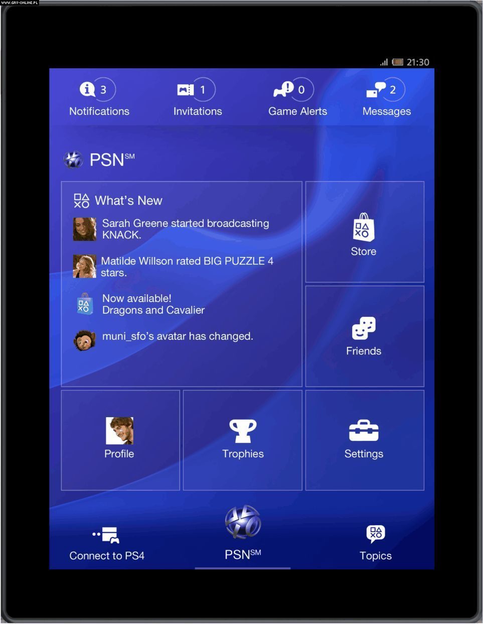 Wiele z powyższych opcji będzie dostępnych z poziomu aplikacji przeznaczonej na tablety i smartfony. Dowodzą tego niektóre ze zdjęć, pochodzące z mobilnej PlayStation App. Na urządzeniu przenośnym będziemy mogli przeglądać profile użytkowników, menu główne konsoli, zakładkę z nowymi grami i wiele innych rzeczy. Połączenie z PlayStation 4 ma nastąpić po wciśnięciu odpowiedniego przycisku.