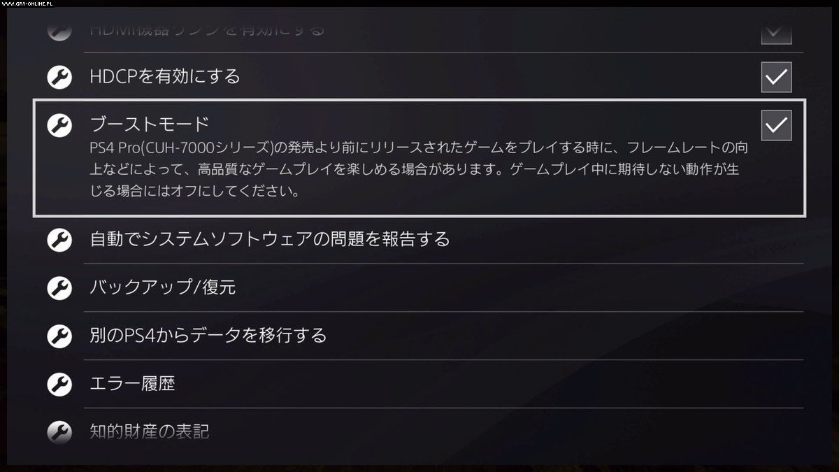 ”W niektórych przypadkach możliwe jest doświadczenie wysokiej jakości rozgrywki, na przykład większej liczby wyświetlanych klatek na sekundę w oprogramowaniu wydanym przed rozpoczęciem sprzedaży PlayStation 4 Pro (seria CUH-7000). Jeśli spotkasz się z nieoczekiwanym działaniem w trakcie gry, prosimy o wyłączenie tej opcji”.