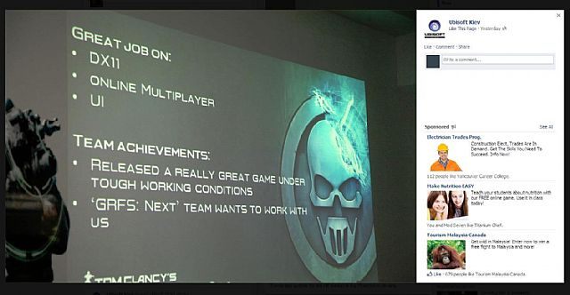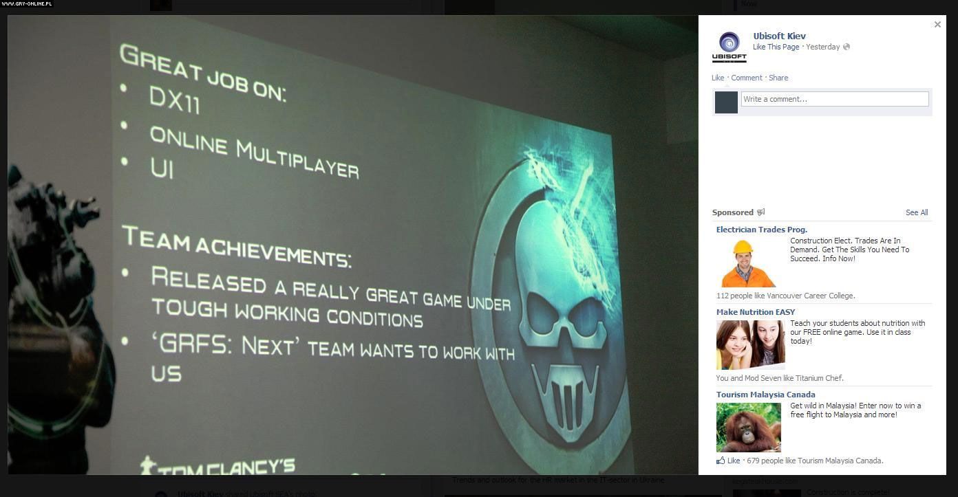 Warto jeszcze zwrócić uwagę na wspomniane na slajdzie trudne warunki produkcji wersji pecetowej. Nie podano konkretów, ale burzliwe losy tego wydania nie są tajemnicą dla nikogo, kto śledził losy gry. Początkowo Tom Clancy's Ghost Recon: Future Soldier miało trafić na komputery w tym samym czasie co edycje konsolowe. Pod koniec zeszłego roku Ubisoft poinformowało o porzuceniu planów wydania gry na PC. Kilka miesięcy później firma zmieniła jednak zdanie. Ostatecznie wersja pecetowa trafiła do sprzedaży miesiąc po premierze na konsolach. Można domyślać się, że studio w Kijowie nie miało zbyt dużo czasu na ukończenie konwersji i to zapewne jest powodem niedociągnięć technologicznych, za które krytykowane było komputerowe Tom Clancy's Ghost Recon: Future Soldier. Pozostaje mieć nadzieję, że w przypadku kontynuacji będzie lepiej.