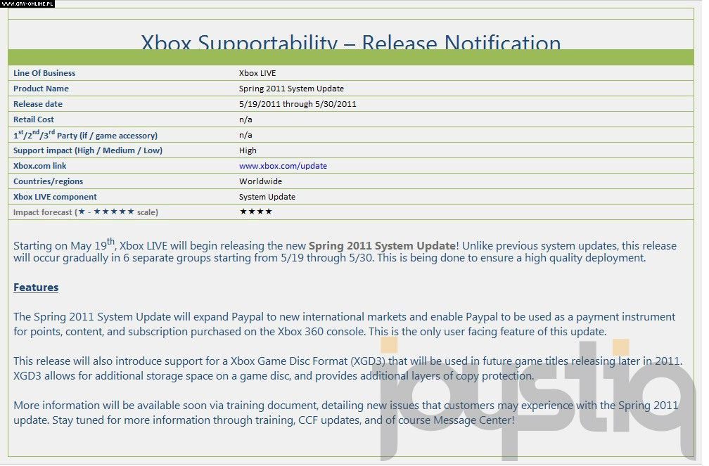 Wsparcie dla nowych nośników (oznaczonych nazwą kodową XGD3) jest testowane już od ponad miesiąca. Dzięki nim deweloperzy dostaną więcej miejsca na gry oraz lepsze zabezpieczenia antypirackie. Według zapewnień, nowy format ma pojawić się w tytułach, które ukażą się w późniejszym okresie bieżącego roku. Użytkownicy powinni być też zadowoleni z wprowadzenia usługi PayPal. Dzięki niej Microsoft ma nadzieję na ułatwienie dostępu do swojej oferty osobom, które w inny sposób nie mogą dokonywać zakupów na Xbox Live Arcade.