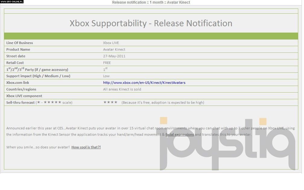 Warto też wspomnieć, że oprócz tych dwóch nowości 27 maja ma się pojawić obsługa Avatar Kinect, czyli swego rodzaju chatu, który dzięki Kinectowi rejestruje naszą mimikę, ruchy rąk i głowy, a następnie przekłada je na wyraz twarzy i poczynania Avatarów. Z oczywistych względów, to uaktualnienie nie będzie automatycznie ściągane na dysk twardy naszej konsoli i zainteresowani nim użytkownicy będą musieli je pobrać ręcznie.