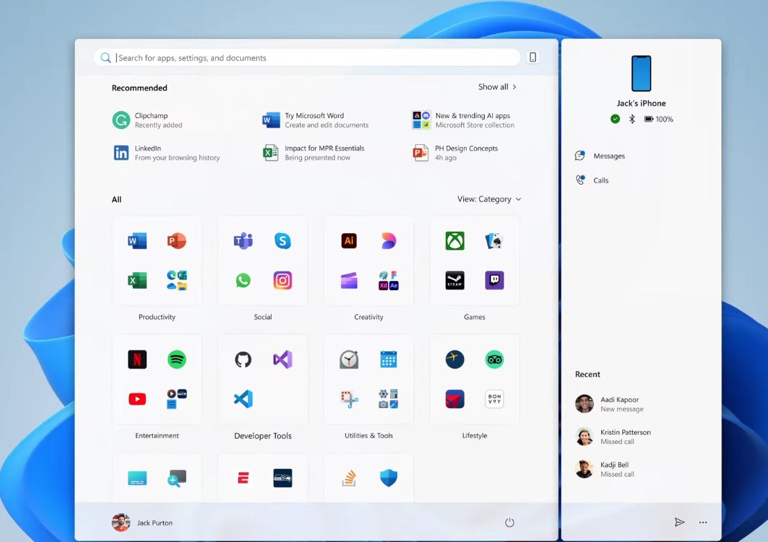 Kolejna istotna nowość to bezpośrednia integracja smartfona z menu Start. Dzięki funkcji znanej jako Phone Link, użytkownik może bezpośrednio z poziomu menu sprawdzać wiadomości SMS, inicjować połączenia, podejrzeć poziom baterii telefonu oraz przeglądać ostatnie kontakty.