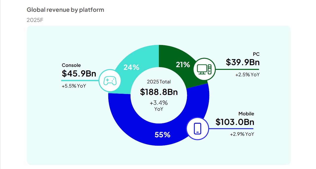 Szacuje się, że całkowite przychody z rynku PC wyniosą 39,9 mld dolarów (+2,5% w stosunku do poprzedniego roku), natomiast w przypadku konsol będzie to ok. 45,9 mld dolarów (+5,5%). Prym w przewidywaniach dotyczących profitów wiodą gry mobilne z aż 103 mld dolarów (+2,9%), co daje łączną kwotę 188,8 mld dolarów (+3,4%). Na ten wynik wpływ będą mieli przede wszystkim gracze z Chin oraz Japonii, jak również osoby urodzone po 2010 roku. Statystyki powinny znacznie podskoczyć w 2026 roku, po premierze Grand Theft Auto VI.