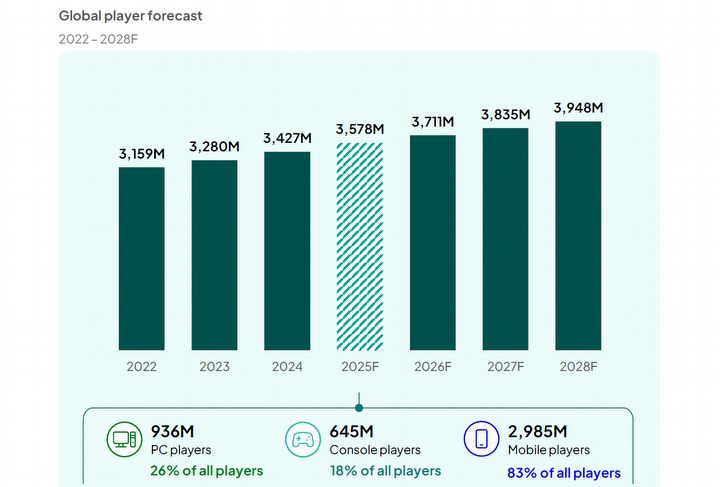 Według Newzoo w 2025 roku łączna liczba graczy przekroczy 3,6 miliarda, co oznacza wzrost o +4.4% względem zeszłego roku. Na ten wynik składają się użytkownicy pecetów (936 milionów), konsol (645 milionów) oraz urządzeń mobilnych (3 miliardy). W przyszłości mają pojawić się bardziej innowacyjne metody monetyzacji, ale choć liczba kupujących osób będzie wzrastać, do 2028 roku spodziewany jest spadek średnich wydatków na płatnika.