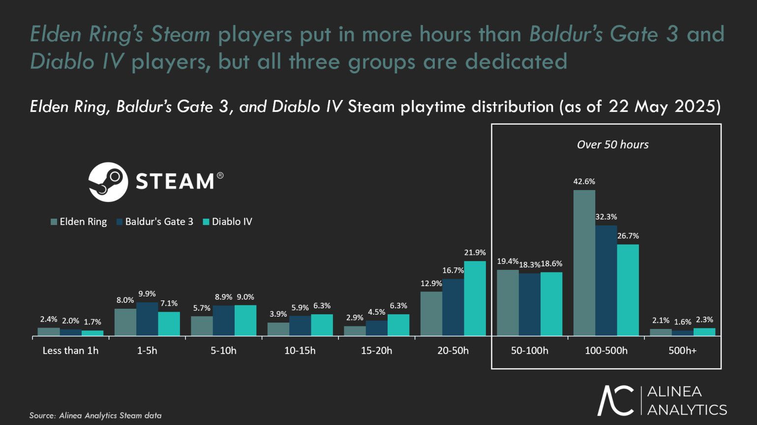 Aby było jeszcze ciekawiej, Alinea Analytics zestawiło zaangażowanie graczy Elden Ring na Steamie z dwoma innymi tytułami: Baldur’s Gate 3 oraz Diablo 4. Wszystkie trzy gry potrafią wyrwać z naszego życia spokojnie ponad setkę godzin, co doskonale widać na poniższym wykresie.