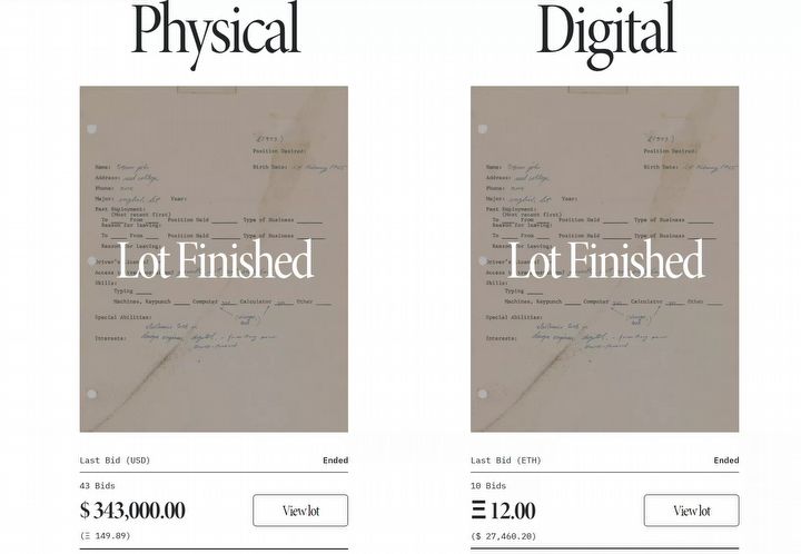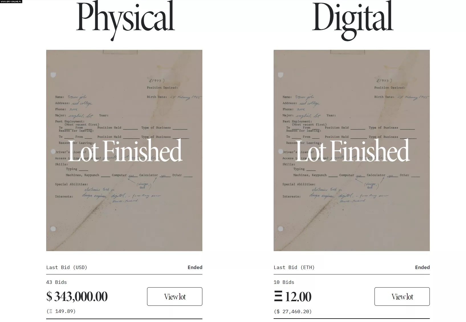 Chętni mogli brać zatem udział w dwóch licytacjach jednocześnie. Przed samą aukcją można było wypełnić ankietę, by zdecydować, który przedmiot osiągnie wyższą cenę. Jak można się było spodziewać, wygrała forma papierowa, na którą zagłosowało oddało 80% osób. Koniec końców za fizyczną wersję podania o pracę Steve’a Jobsa szczęśliwy nabywca zapłacił ok. 1,2 miliona złotych. Wersja z tokenem NFT została wylicytowana za prawie 106 tysięcy złotych.