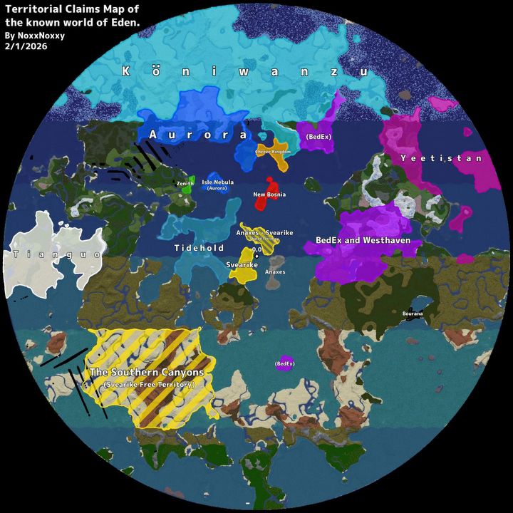 Z początkowego chaosu wyłonił się nowy porządek świata. Jeden z organizatorów, użytkownik o nicku Tylerrr93, opublikował mapę polityczną serwera, na której widać wyraźne granice stref wpływów. Powstały całe narody z własną tożsamością i gospodarką. Przykładem jest „Yeetistan”, kontrolujący wyspy grzybowe i monopolizujący rynek skóry oraz wołowiny, czy izolacjonistyczne „Tianguo” inspirowane kulturą azjatycką. Z kolei „BedEx” to miasto-państwo funkcjonujące jako hub handlowy z własnym kodeksem prawnym.
