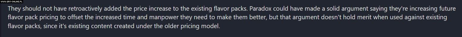 Nie powinni zmieniać ceny istniejących Flavor Packów. Paradox mógłby sformułować solidny argument, twierdząc, że zwiększają cenę Flavor Packów wydawanych w przyszłości, by odzwierciedlić większą ilość czasu i środków, które będą poświęcane, by DLC były lepsze, ale ten argument nie ma sensu, gdy używa się go w kontekście już istniejących paczek, które tworzono w oparciu o starszy model cenowy.