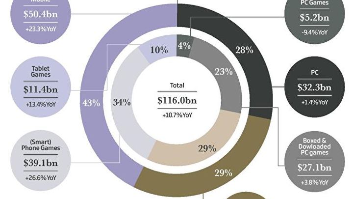 Jako że zbliża się koniec roku, pora na wszelkiego rodzaju podsumowania. Dziś możemy przyjrzeć się statystykom związanym z rynkiem gier wideo od GamesIndustry.biz. Okazuje się, że zyski ze sprzedaży na komputerach osobistych są niemal tak wysokie jak te ze sprzedaży produkcji na wszystkie konsole razem wzięte - a i tak obie te grupy platform są daleko w tyle za urządzeniami mobilnymi.