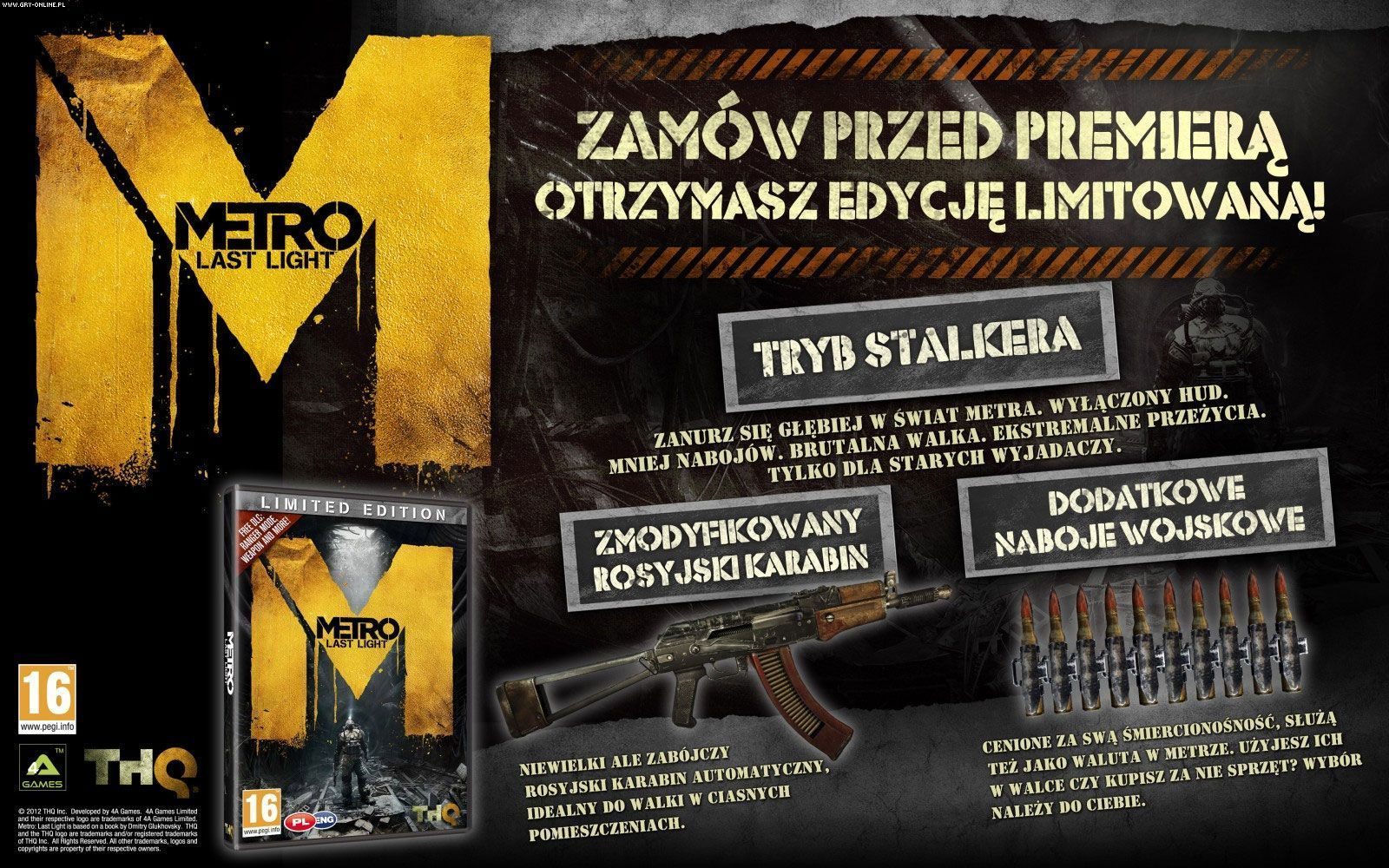Natomiast firma Cenega ogłosiła, że wszyscy gracze, którzy złożą preordera na grę Metro: Last Light otrzymają Edycję Limitowaną. Zawierać ona będzie: