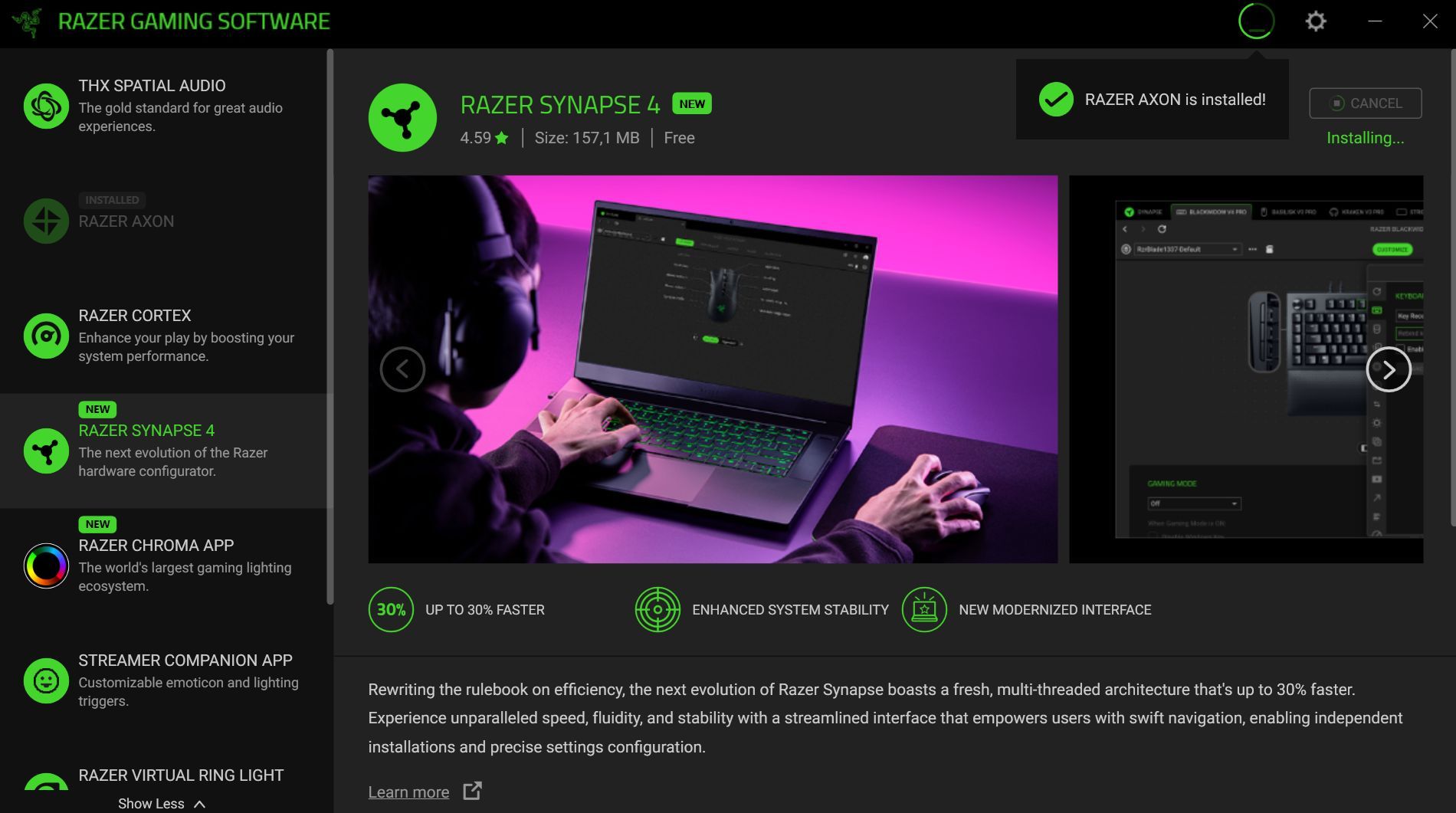 Razer znany jest ze swoich licznych aplikacji skierowanych dla graczy. Obecnie mamy już 4. generację aplikacji Synapse, przez co momentami można się pogubić. Na szczęście jak przez to przebrniemy, naszym oczom ukazuje się przyjemny hub, w którym można poustawiać wszystko – od trybu odtwarzania dźwięku, po kwestie podświetlenia.