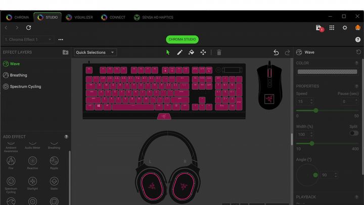 Jeśli chodzi o ustawienia RGB, to dostajemy wszystko, czego możemy wymagać od serii CHROMA – personalizacja blisko 17 milionów kolorów, wszelkie tryby kolorystyczne czy możliwość ustawienia wszelkiego sprzętu producenta w dowolny sposób pod siebie. Wariantów jest tak wiele, jak wspomnianych kolorów.