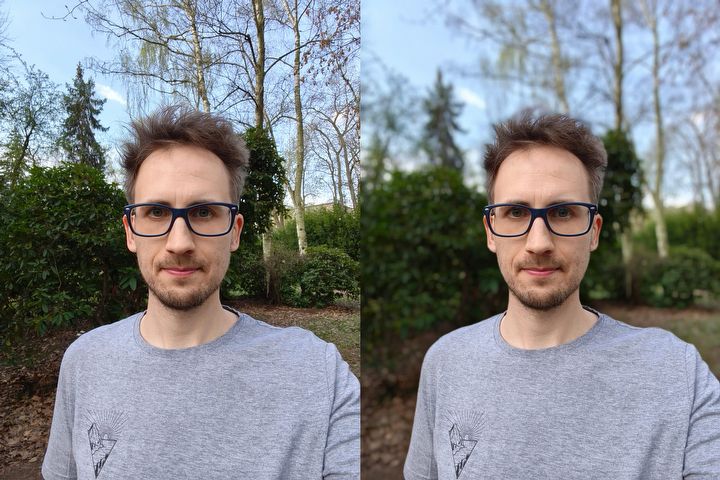 Przedni aparat radzi sobie całkiem nieźle i z reguły byłem zadowolony z efektów. Bez problemu poradzi sobie z robieniem selfie w czasie wyjazdu czy spotkania ze znajomymi. Choć wiadomo, przede wszystkim w dobrych warunkach oświetleniowych. Tryb portretowy rozmywa dość ładnie, choć nieprecyzyjnie, co widać nie tylko na mojej rozczochranej fryzurze, ale też krawędziach twarzy i ramion.