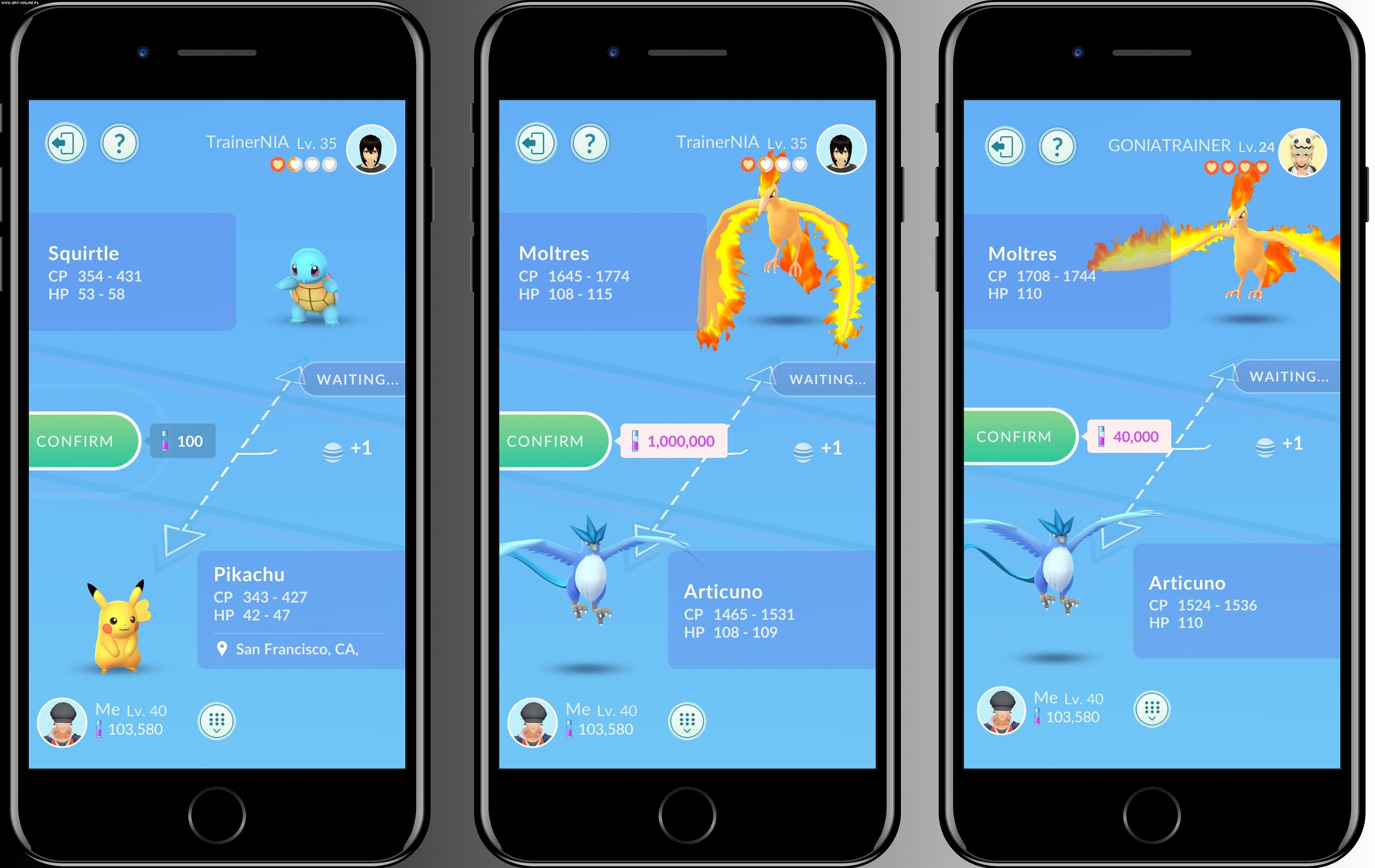 Tu dochodzimy do dla wielu najważniejszej nowości – systemu wymiany. Będzie on dostępny od 10 poziomu i rangi Great Friend, jeśli obaj trenerzy znajdują się w odległości 100 metrów od siebie. Każda transakcja również zwiększy poziom Przyjaźni, lecz także wymusi wydanie określonej liczby gwiezdnego pyłu (Stardust). Koszt będzie zależny tak od rodzaju wymienianych stworków, jak i naszej relacji z danym trenerem. Różnica między rangami może być dość znaczna: na jednym z udostępnionych screenów wymiana dwóch legendarnych pokemonów kosztuje milion (!) pyłu, ale już dla „najlepszych przyjaciół” trzeba go mieć tylko 40 tysięcy.