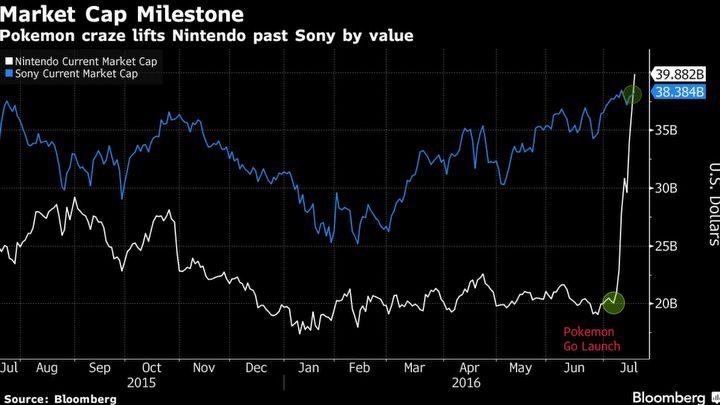 Pokemonowa gorączka nie przestaje zaskakiwać i wpływa w znaczącym stopniu na rynki finansowe. Według tokijskiego indeksu giełdowego, w przeciągu dwóch ostatnich tygodni wartość Nintendo uległa podwojeniu, osiągając pułap blisko 40 miliardów dolarów i prześcigając pod tym względem cały koncern Sony.