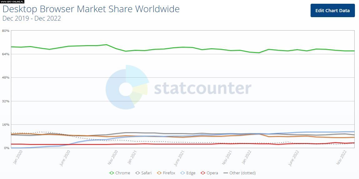 Jak prezentuje się reszta rankingu w przypadku komputerów osobistych? Na drugim miejscu uplasował się Microsoft Edge, który zyskał przychylność prawie 11% użytkowników. Podium zamyka Safari, które można kojarzyć przede wszystkim z urządzeń z nadgryzionym jabłkiem jako logo. Na dalszych miejscach widnieją Firefox oraz Opera, które mogą pochwalić się udziałem na rynku przeglądarek internetowych na poziomie odpowiednio 7,22% oraz 3,29%.