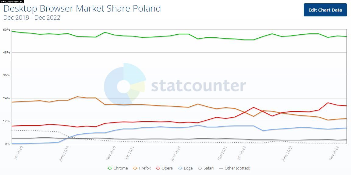 Nietypowo prezentuje się natomiast drugie miejsce, na którym znalazła się Opera. Na 19,85% komputerów w naszym kraju wykorzystuje się właśnie tę przeglądarkę. Jest to więc dość spore zaskoczenie, zważywszy na fakt, że program ten znacząco stracił na popularności na całym świecie. Jasno to jednak pokazuje, jak bardzo przyzwyczajeni są niektórzy użytkownicy w Polsce. Podium zamyka Mozilla Firefox z udziałem na rynku na poziomie 13,19%.