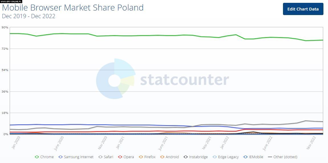 Podobnie wygląda to w przypadku urządzeń mobilnych, gdzie aż 64,2% użytkowników na całym świecie korzysta właśnie z Google Chrome. Wyższość przeglądarki znanej ze sprzętu z Androidem musiały uznać między innymi Safari od Apple (23,59%) oraz Samsung Internet (5,09%).